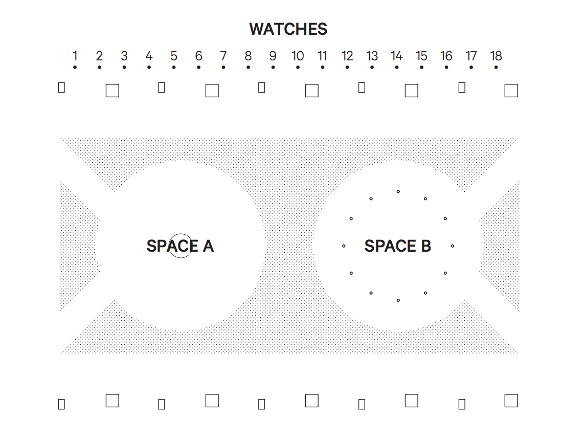 SPACE A: organic, random, continuous, analogue, coincident, micro, now The 60 mechanical movements on the table constantly vibrate to express the continual/perpetual flow of time.